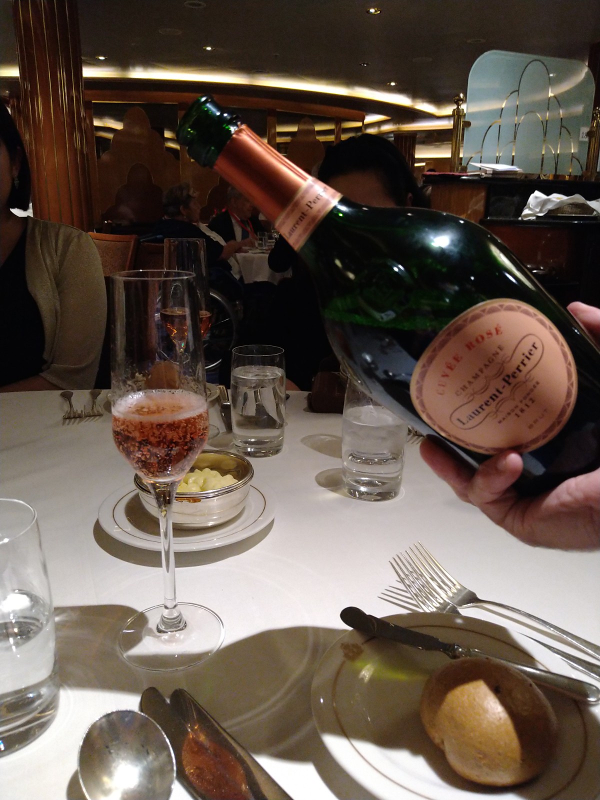 英国王室御用達のLaurent Perrierをはじめ、各国の選りすぐりのワインがオンリストされている。英国の船だけあり、英国のスパークリングワインとスティルワイン(珍しい!)も楽しめる。Nyetimber Classic Cuvee、Gasbourne Blanc de Blanc、Bacchus Chapel Down・・・・・・。