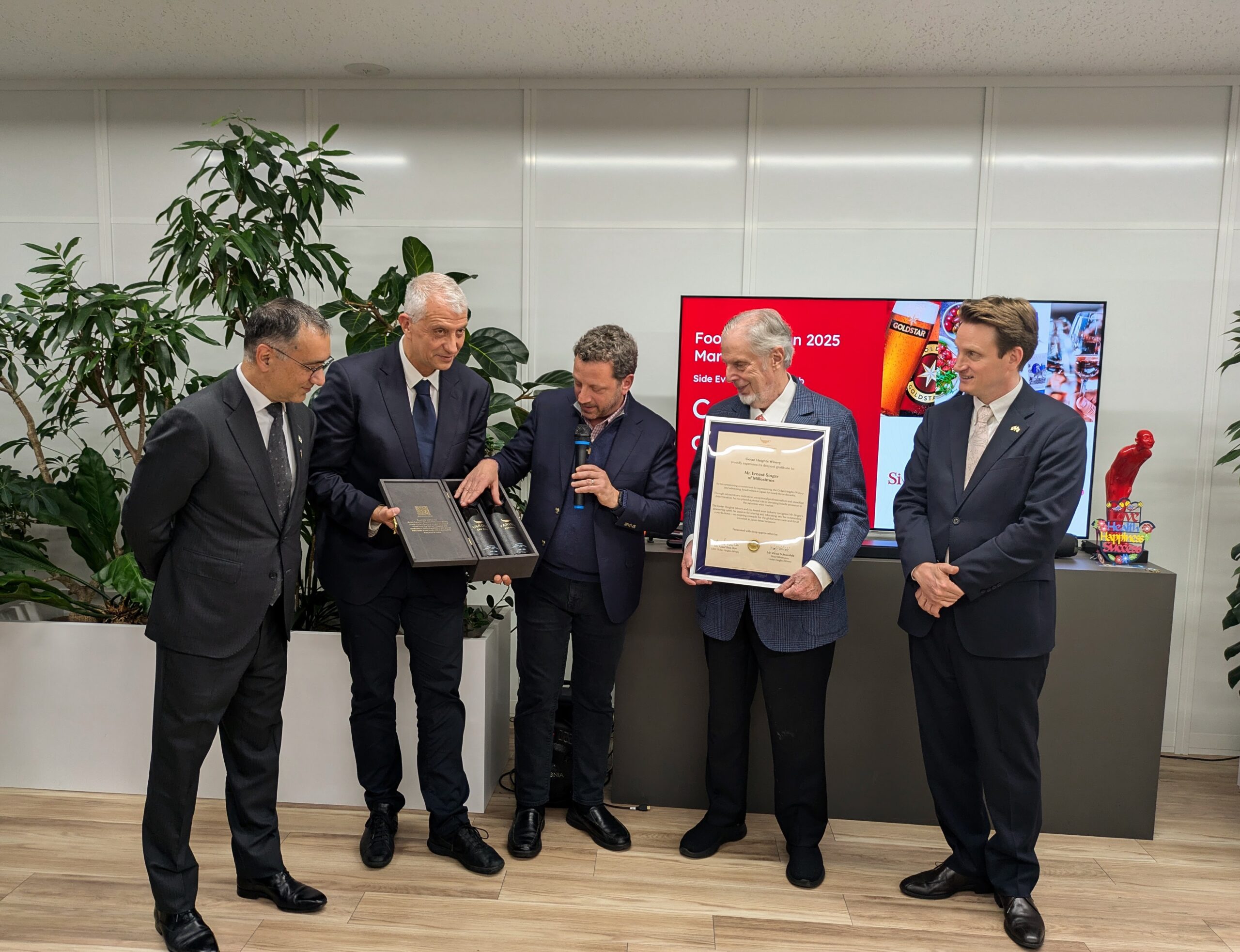 イベントには、駐日イスラエル大使 ギラッド・コーヘン 氏も参加し、イスラエルの食とワイン文化の魅力について語った。来場者は、ワイン、ビール、蒸留酒の試飲を楽しみながら、イスラエルのユニークな食品や飲料のプレゼンテーションに耳を傾けた。Golan Heights、TULIP、Brado、Teperberg などのワイナリーのワインも振る舞われ、その多様な味わいを堪能。イスラエルのワイン産業は規模こそ小さいが、その品質と個性で世界のワインシーンに確かな存在感を示している。なかでも Golan Heights Winery のヘッドワインメーカーである Victor Schoenfeld 氏は、長年にわたりイスラエルワインの品質向上に尽力し、火山性土壌と高地の気候を活かしたワイン造りを推進してきた。Schoenfeld 氏の手掛ける YARDEN ブランドのワインは、日本市場でも高い評価を得ている。この YARDEN ブランドのワインを日本に輸入・紹介してきたのが、アーネスト・シンガー 氏(ワイン輸入商社ミレジムおよび富士山ワイナリー経営者)である。シンガー 氏は約30年間 にわたりイスラエルワインの普及に尽力し、その価値を広めてきた。今回のイベントでは、長年の貢献を称え表彰されるとともに、Golan Heights Wineryの40周年記念として造られた特別なワインを贈呈される場面もあった。
