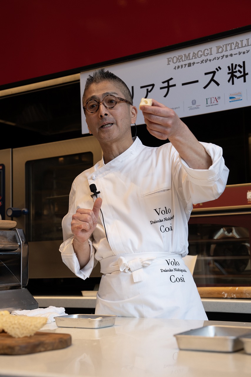 講習会の第一部では、本間るみ子氏(チーズの輸入会社フェルミエ創業者、NPO法人チーズプロフェショナル協会名誉会長)のセミナー「世界に広がるイタリアチーズ」が行われた。第二部では、リストランテ ヴォーロ・コズィ(東京都文京区)のオーナーシェフ西口大輔氏が、前菜からドルチェまでイタリアチーズを使った5品の調理デモンストレーションを披露した。