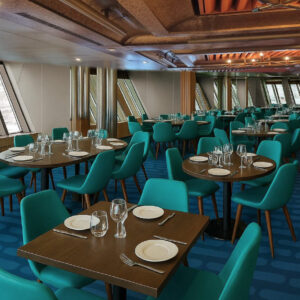 記者会見の後、改装後の船内を見学した。メインホールはブルーを基調としたモダンな内装に一新され、家具やカーペットも刷新。メインダイニングも椅子とテーブルを新調し、グリーンを基調とした落ち着いた雰囲気になった。客室はナチュラルな白とブルーを基調としたコンテンポラリーな意匠に生まれ変わり、バスルームのシャワーブースも新しくなった。全体的にとても明るくカラフルな印象だ。リピーターが見れば、その大胆な変化に驚くこと間違いない。