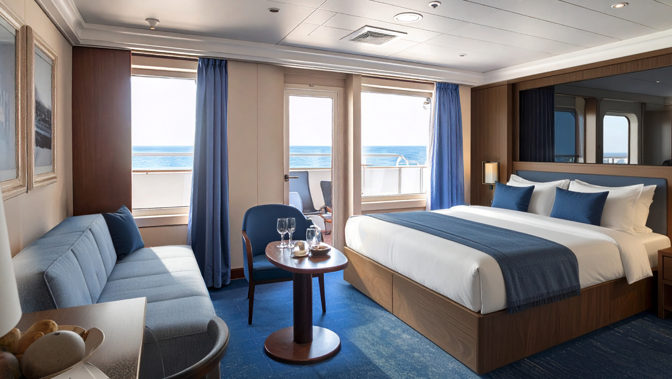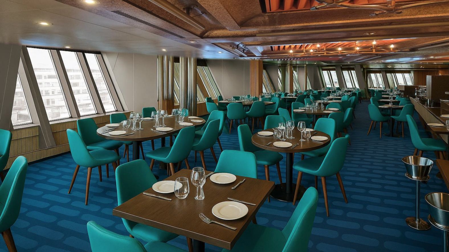 記者会見の後、改装後の船内を見学した。メインホールはブルーを基調としたモダンな内装に一新され、家具やカーペットも刷新。メインダイニングも椅子とテーブルを新調し、グリーンを基調とした落ち着いた雰囲気になった。客室はナチュラルな白とブルーを基調としたコンテンポラリーな意匠に生まれ変わり、バスルームのシャワーブースも新しくなった。全体的にとても明るくカラフルな印象だ。リピーターが見れば、その大胆な変化に驚くこと間違いない。