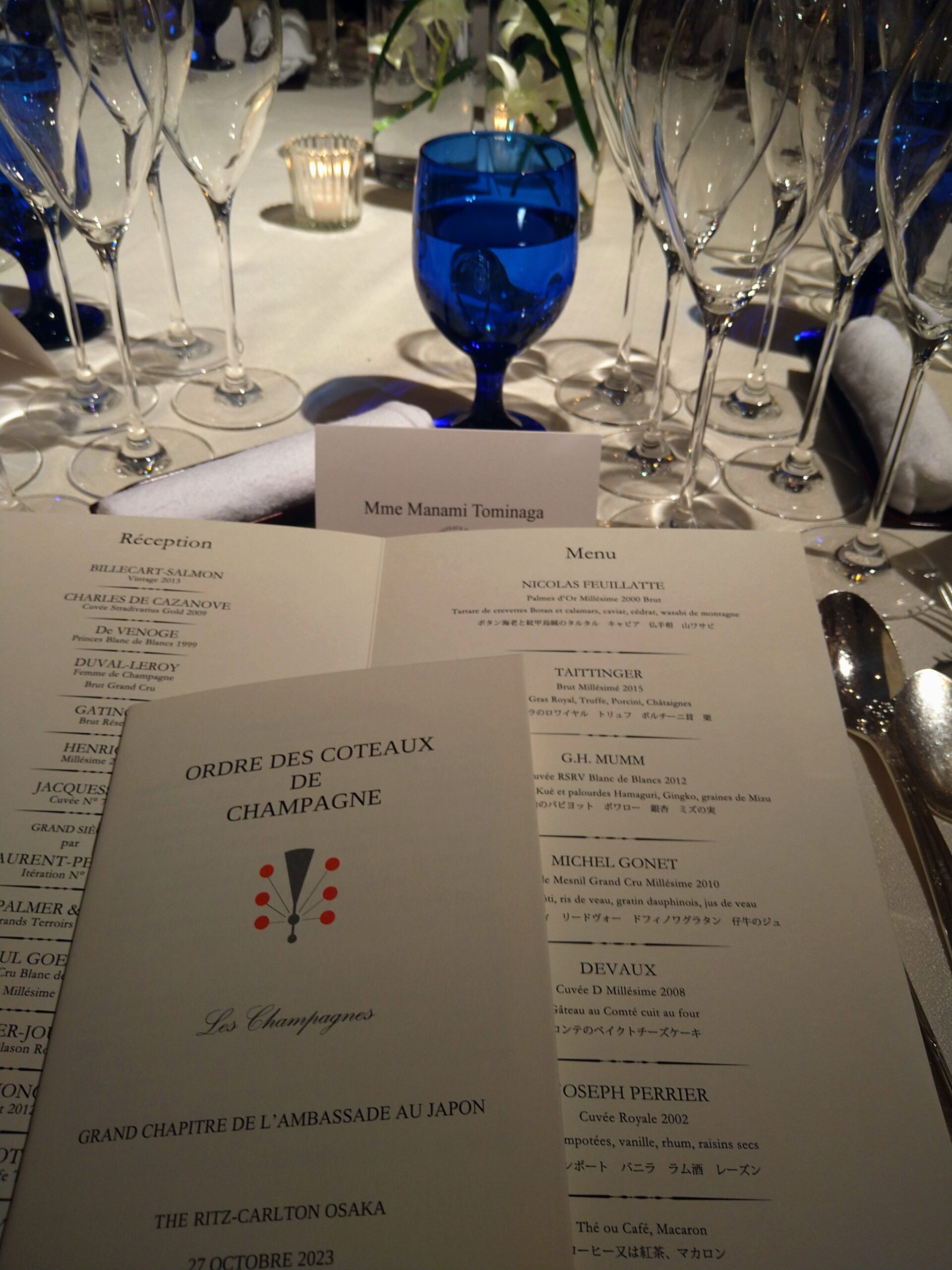 ザ・リッツ・カールトン大阪で開催された360名が集うこの式典とディナーは、聞きしに勝る絢爛豪華なイベントであった。過去に叙任された数名の知り合いから、式典とガラディナーの雰囲気を聞いていたが百聞は一見に如かずとはこのことを言う。アペリティフでは14メゾンのシャンパーニュを、ガラディナーでは6種類のシャンパーニュを卓越した味わいのディナーと共に堪能した。年に一度の式典とガラディナーを君嶋屋のピエール・モンキュイのテーブルにて体験できたことは大きな幸運だったと思う。数多くの貴重な出会いと再会もあった。